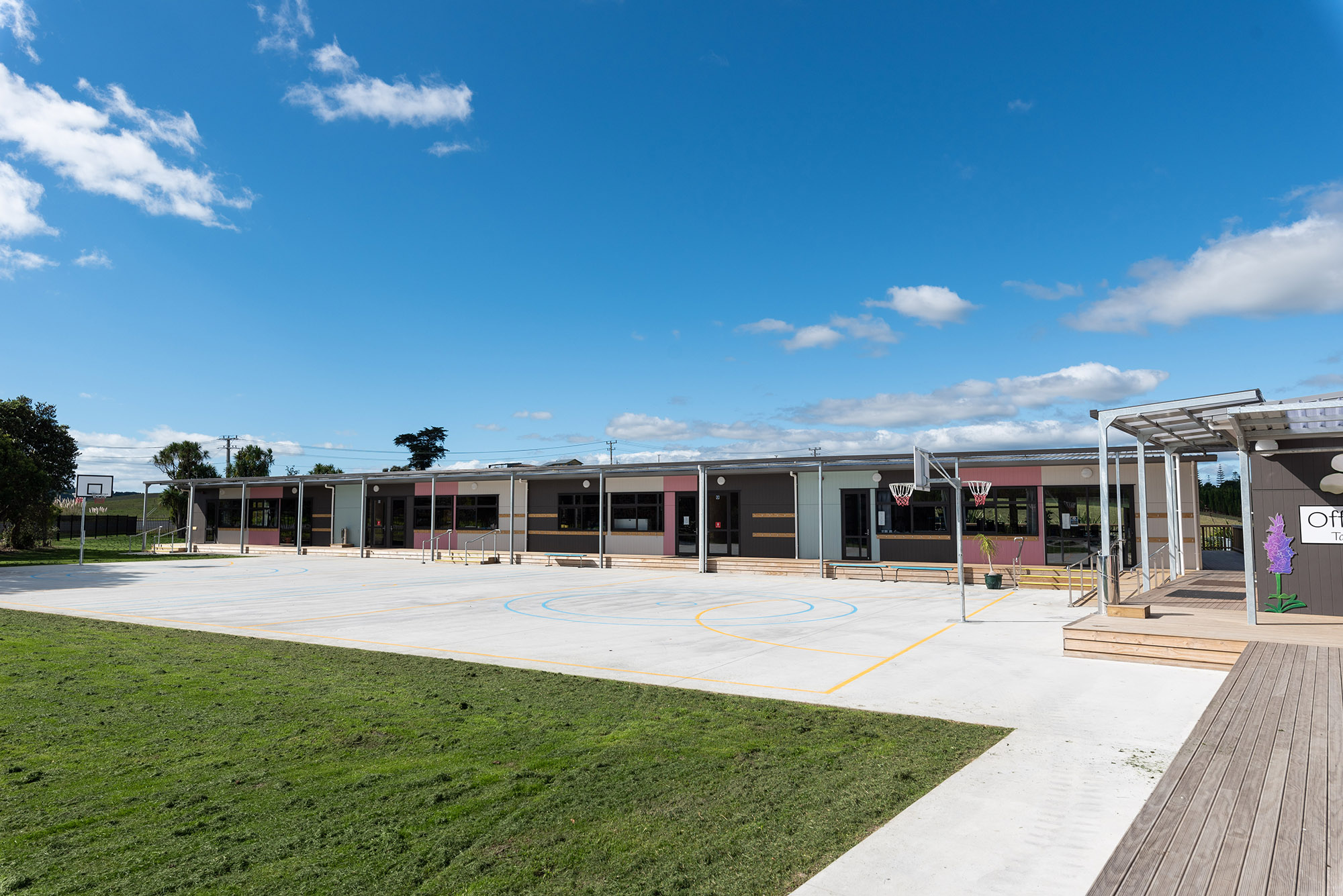 Oturu School involved constructing twelve new buildings which were built both on-site and off-site as a hybrid build and then demolishing the existing ones. The classrooms, admin, and cooking rooms were all built off-site with the hall at the front being built on-site. A new carpark and drop off/pick up bay were created. After demolition, new fields were completed and new changing sheds were built for the pool.